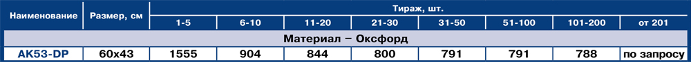 | AK53-DP | 40х60 | Полноцветное нанесение | Оксфорд | .CDR | 0 руб. | ||